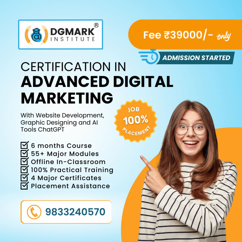 Each course is taught by experienced industry experts and includes live project training, certifications, internship opportunities, and 100% placement assistance. Whether you’re looking to start a digital career, grow your business, or earn as a freelancer, DGmark’s practical learning approach prepares you for real-world success in today’s digital landscape.